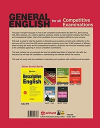 English is globally recognized language for cross-border business communication. As a dominant business language, fluency and expertise in the language can help you build great opportunities of professional growth. The paper of English language usually contains Questions relating to Grammatical Concepts, Word Power and Compositional English in almost all competitive examinations like Bank PO, Bank Clerical, CDS, NDA, Railways, etc. The book of General English includes over 600 Practice Exercises and 10,000 Words & Sentences Structures for all Competitive exams divided in 32 chapters. Each chapter comprehensively contains short synopsis, detailed description of important rules and enough practice exercises. Almost all types of objective questions and previous years? questions that appear in Competitive examinations have been compiled together to help the candidates in understanding the rationale behind the answers. Table of ContentSpotting the Errors, Phrase Substitution and Sentence Improvement, Ordering of Sentences , Ordering of Words/Rearranging the Sentence, Cloze Test/Passages, Choosing Appropriate Words, Double Blanks in a Sentence, Related Pair of Words, Synonyms/Antonyms, Idioms and Phrases, Homonyms, Phrasal Verbs, Comprehension, Tense, Forms of Verbs, Modals, Subject-Verb Agreement, Non-Finites, Noun, Pronoun, Articles, Preposition, Conjunction, Adjectives and Determiners, Adverbs, Question Tags, Conditionals, Un-English and Superfluous Expressions Reported Speech (Direct- Indirect Narrations), Active-Passive...