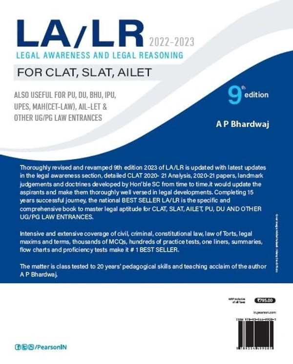 Legal Awareness and Legal Reasoning 2022-2023 |For CLAT/SLAT/AILET | Detailed Analysis of 2020-2021 pattern| Includes 2021 & 2020 papers |Ninth Edition |By Pearson