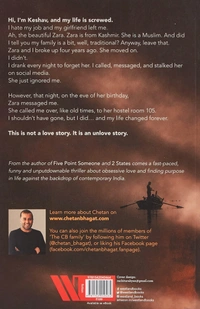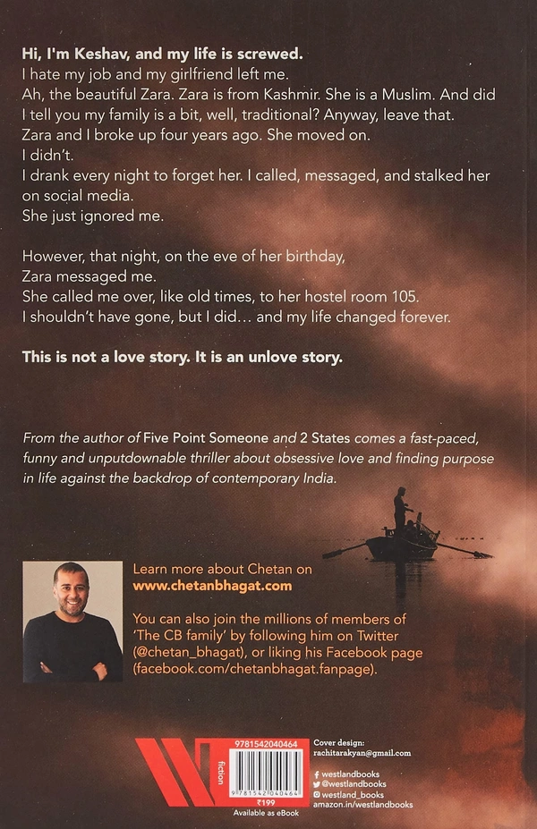 Hi, I���m Keshav, and my life is screwed. I hate my job and my girlfriend left me. Ah, the beautiful Zara. Zara is from Kashmir. She is a Muslim. And did I tell you my family is a bit, well, traditional? Anyway, leave that. Zara and I broke up four years ago. She moved on in life. I didn���t. I drank every night to forget her. I called, messaged, and stalked her on social media. She just ignored me. However, that night, on the eve of her birthday, Zara messaged me. She called me over, like old times, to her hostel room 105. I shouldn���t have gone, but I did��� and my life changed forever. This is not a love story. It is an unlove story. From the author of Five Point Someone and 2 States, comes a fast-paced, funny and unputdownable thriller about obsessive love and finding purpose in life against the backdrop of contemporary India.